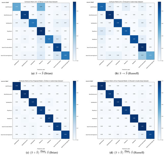 Figure 4 provides the confusion matrices corresponding to both the results of Brian and Russell in Table 6 for a more detailed analysis. As shown in Figure 4a,b, even though there are only seven intent classes, more than half of them do not exceed 90% accuracy. Specifically, in Figure 4a,b, the accuracy of label “AddToPlaylist” are 0.50 and 0.76, and that of “SearchScreeningEvent” are 0.68 and 0.50. This is due to the recognition errors and it means that it is difficult to accurately classify the users’ intents in the noisy environment using models trained only with labeled text.