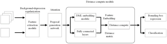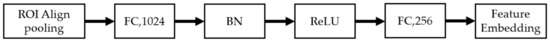 As shown in Figure 5, the eigenvector M is input into the DML layer after ROI Align pooling. It enters first into the fully connected layer with 1024 dimensions, and then it is sent into the BN [37] layer and ReLU activation layer [38] for standardization. Lastly, by calculating the embedded eigenvector E through a fully connected layer with 256 dimensions, it is used for subsequent estimation of the sample distance.