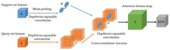 where h, w, and c are the height, width, and number of channels of the feature map, respectively. X is the features of the support set, and , Y is the features of the query set, and . H and W are the height and width value, respectively, of the feature map Y. The enhanced region proposal network learns the similarities in the features of the support set and the query set through depth-wise separable convolution and then generates the candidate box based on the similarities, as shown in Figure 4.