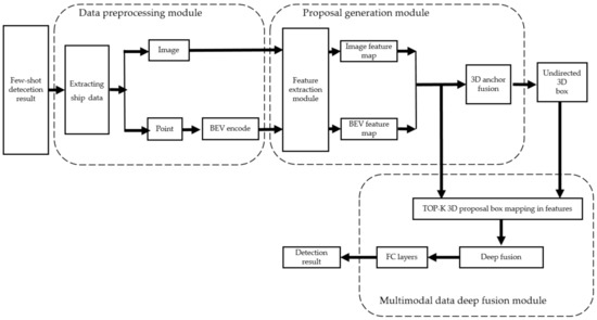 In this paper, we propose a few-shot surface object detection model that takes multimodal data as input and predicts the full 3D extent of objects on the water surface. The proposed network is supposed to detect obstacles and recognize targets (location and position) on a small-scale dataset. As illustrated in Figure 2, the few-shot surface object detection model consists of two parts: a few-shot object detection network and a 3D object detection network. The few-shot object detection network utilizes small-scale datasets (image) to perform the detection of objects, which consists of five components: feature extraction module, proposal generation network, distance compute module, bounding box regression and classification. Then, detection results (labelled image and point cloud) are screened to extract categories of key surface objects to locate the ship objects that will be taken as target objects for 3D object detection.