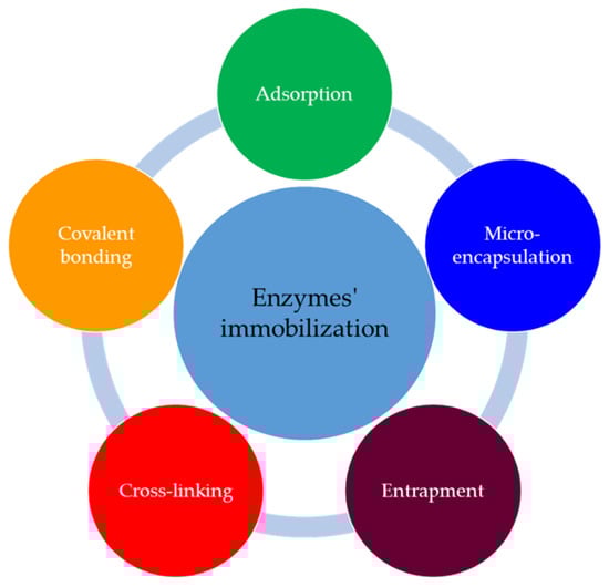 The essential requirements of an enzymatic biosensor are the immobilization the enzymes to the transducer’s surface and maintenance of their activity after immobilization [48]. The immobilized enzymes are more stable than the mobile versions and can be repetitively and continuously used [52]. The main methods for enzyme immobilization are presented in Figure 4, and in Table 1 are the characteristics of these.
