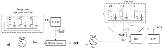 Simplified block diagram of two main time-domain temperature sensor architectures [3]: (a) delay time and (b) clock period.