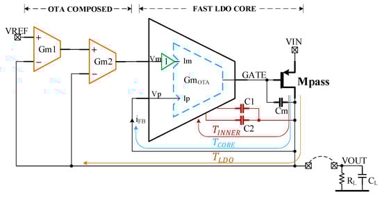 The topology of the LDO proposed here is shown in Figure 2. It consists of three Gm cells, each of them connected to the LDO output by total negative feedback loops. This arrangement allows for each Gm cell to be optimized individually, targeting different features. The innermost cell—denoted in Figure 2—together with the pass transistor compose the fast core of the LDO. The cell drives the large parasitic capacitance present at the pass transistor gate, so it is optimized for high speed and wide bandwidth. The other two cells—denoted Gm1 and Gm2 in Figure 2– create a composite OTA (COTA) that helps enlarge the DC gain of the voltage-control loop of the LDO and determines its input offset voltage. Therefore, the COTA is optimized for large gain and low offset.