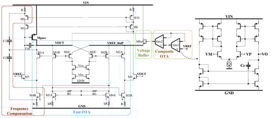 The source follower does not significantly impact the frequency characteristics of the LDO loop gain. Thus, it is possible to ensure the stability of the LDO presented here, even if it comprises one more stage than the LDO reported in [10]: the additional gain stage implemented by the composite OTA, which brings in another two poles and one zero.