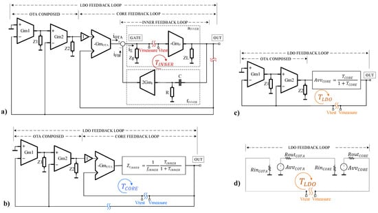 Small signal diagram of the LDO showing simplified representations of the small-signal model for computing (a), (b), and (c,d) feedback loops. After each step, the resulting loop gain is replaced by its equivalent circuit, derived by using classical feedback theory.