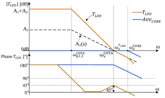 To analyze the condition 1, one can use the results obtained in [10], as this section of the circuit proposed in Figure 3 is similar to the entire circuit reported in [10]: near the unity gain frequency , so the gain- and phase-margin corresponding to can be derived by analyzing the frequency characteristics of . This way, one reaches the conclusion that the following design constraint must be observed in order to ensure a good phase margin for the :