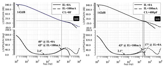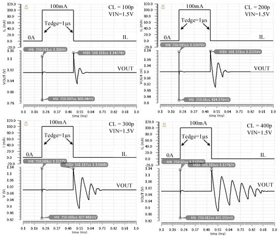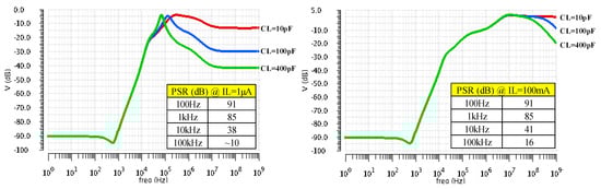 - Tang, X.; He, L. Capacitor-free, fast transient response CMOS low-dropout regulator with multiple-loop control. In Proceedings of the 2011 9th IEEE International Conference on ASIC, Xiamen, China, 25 October 2011; pp. 104–107. [Google Scholar] [CrossRef]