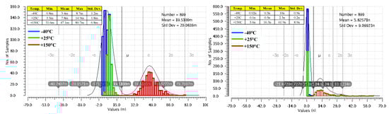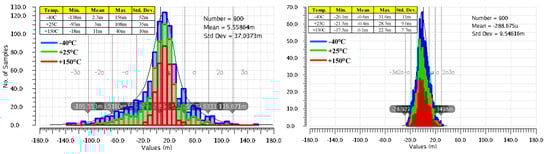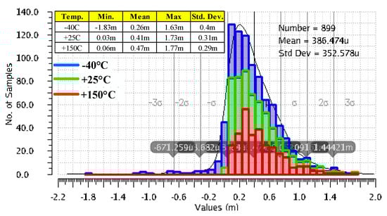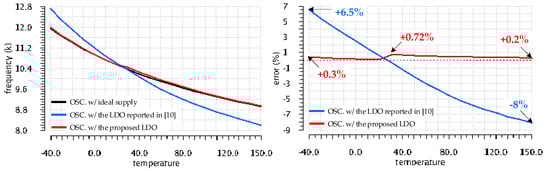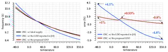 A comprehensive set of simulations were presented for the ensemble LDO and temperature-dependent ring oscillator at the core of the sensor. It supported a comparative analysis of the impact the supply sources have on the oscillating frequency over the automotive temperature range. The smaller offset voltage, with a smaller temperature drift, exhibited by the proposed LDO resulted in a significant reduction in the frequency error registered for the oscillator it supplied, compared with the error registered for the same oscillator when supplied by a general purpose LDO reported earlier. Over the temperature range of −40 °C to +150 °C, the respective errors took the following values: from +1% to −0.8%, compared with +4.1% to −4.8%.
