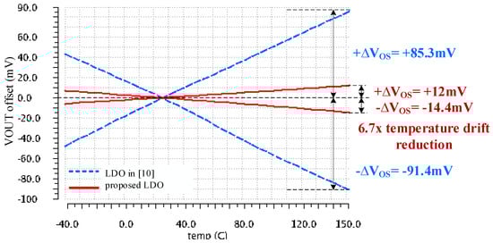 - The thermal drift of the output voltage offset caused by component mismatches, across the temperature range of −40 °C to +150 °C, is 9.5 smaller for our LDO than the one provided by the LDO in [10], which was integrated in the same process.