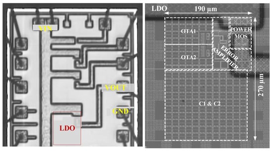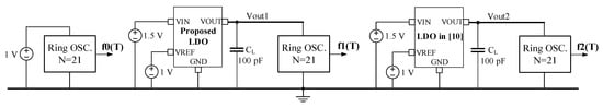 The LDO proposed in Figure 3 was implemented in a standard 130 nm CMOS process with requirements tailored for supplying several time-domain temperature sensors with architectures similar to the ones in [26,27,28,29,30,31,32], as well as their additional digital processing and control circuitry.