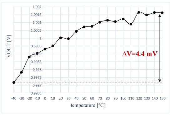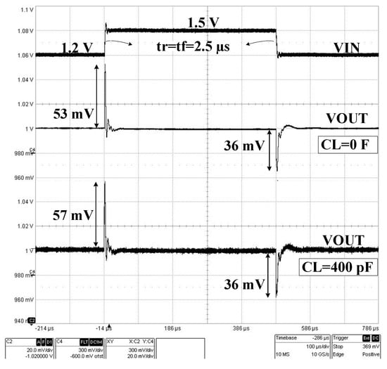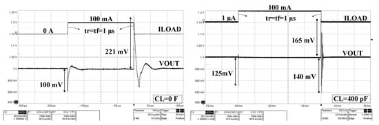Simulation and measurement results performed on a test chip implemented in standard 130 nm CMOS process validated the proposed LDO. The LDO requires only 1.4 µA quiescent current but exhibits an excellent response to load transients. When the load current jumps from 0 A to 100 mA in 1 µs, the output voltage presents an undershoot of 100 mV and an overshoot of 221 mV, without decoupling capacitors. Due to its high DC gain, the LDO exhibits very good DC load regulation: 1 µV/mA. Moreover, the output-referred LDO offset voltage exhibits a small spread (σ = 9.5 mV) and a very low thermal drift: 14.4 mV over the temperature range of −40 °C to +150 °C, across process variations and mismatch. Overall, the output voltage error caused by component mismatches and variations of the line voltage, load current, and temperature does not exceed +/−35 mV.