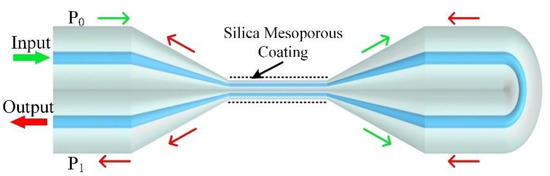 Figure 1 shows the schematic configuration of the proposed AMCs sensor. It consisted of a Sagnac OMFs loop and mesoporous silica coating on the OMFs surface; the Sagnac OMFs loop contained an OMFs coupler and a Sagnac loop. The method of fabricating the Sagnac OMFs loop has already been studied in a previous report [33]. As shown in Figure 1, light injected into port P0 could be coupled and split into clockwise and counterclockwise beams by the OMFs coupler, which propagates along the Sagnac loop; the interference was given by the recombination of the counter-propagating beams at the coupler. The principle of the sensor is that the beating between the lowest order even supermode and odd supermode provides energy transfer between two OMFs; wavelength dips in spectral region can be obtained as a result of the optical path difference between the two supermodes accumulated along the coupling region [34].