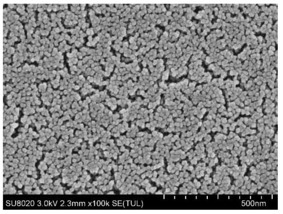 Figure 2 illustrates an SEM image of fabricated SiO2 nanoparticles utilizing the Stober method. As shown in the SEM image, the shapes of silica nanoparticles with a diameter of 20.0 nm were not very regular, and the mesoporous coating formed on the glass slide substrate by dense packing and or a van der Waals attraction. In addition, porosity increased due to abundant voids of coatings [39].