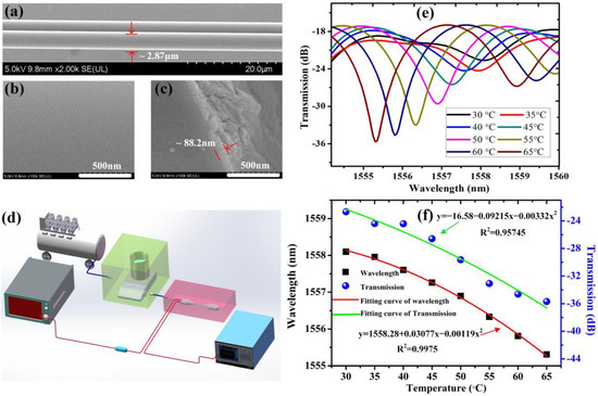 (a) shows a typical SEM image of uniform region of OMFs coupler; (b) shows microtopography of silica mesoporous coating on OMFs coupler; (c) shows a typical SEM image of the cross section of the fabricated sensing unit; (d) the schematic of detection equipment; (e) transmission spectra of the proposed sensor at different Ts; (f) response of the wavelength and intensity of the dip under different Ts.