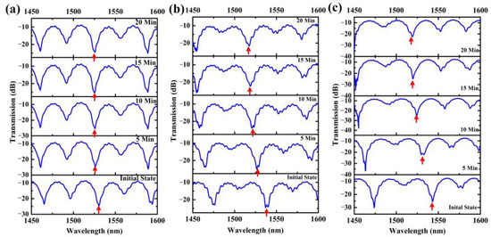 Transmission spectra evolution of the proposed sensor with 3.0 μm diameter at (a) 30 °C, (b) 50 °C and (c) 70 °C, the duration time of heating was 20 min in the experiment. The red arrows in the spectral responses represent corresponding dip wavelength shifts as elapsed time increases.