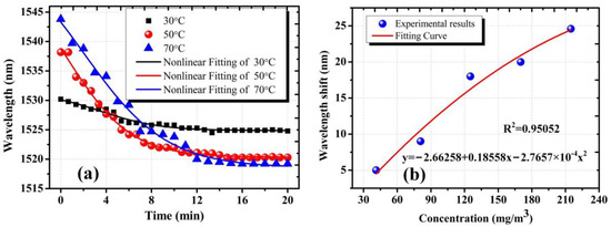 Figure 5b plots the measured wavelength dip change as a function of the concentration of AMCs at different heating temperatures. In the experiment, the heating temperature varied from 30 °C to 70 °C at intervals of 10 °C. In order to achieve equilibrium between adsorption and desorption of AMCs, the duration time of heating was set at 20 min and the spectral response at each temperature was recorded. It showed a polynomial fitting with an R-square of 0.95052; the fitting coefficients were 0.18558 and −2.7657 × 10−4. The wavelength dip shifted from 5.4 nm to 24.8 nm as the concentration increased from 0 to 213 mg/m3. The average sensitivity was ~0.11 nm/(mg/m3). Compared with the previous microfiber structure, the mesoporous silica coating allows for a stronger evanescent-field interaction between AMCs and the sensing waveguide, due to its high porosity and limited thickness.
