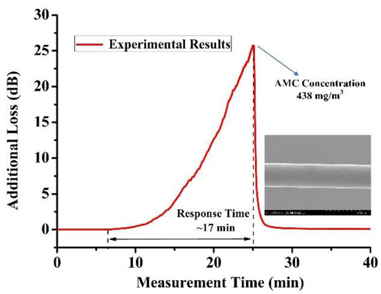The physical adsorption of AMCs in the mesoporous coating of OMFs resulted in modification of the surrounding of RI; the additional loss was produced due to the absorption of the evanescent field. In the experiment, the additional loss caused by the adherence of AMCs was recorded in real time. A DFB laser at 1310nm center wavelength was divided into two beams by a light coupler, one of which was used as the signal light and the other as the reference light to eliminate the error caused by laser power fluctuation. Furthermore, in order to improve measurement accuracy, lock-in amplification technology was adopted in the process of optical signal detection and processing. The photodetector, A/D converter and DSP mode-locked amplifier were integrated into a complete measurement system with a dynamic measurement range of about 25 dB; our own software was developed to process and store the monitoring data. We employed the experimental setup shown in Figure 3d to evaluate technical characteristics of the OMFs sensors. The heating temperature was gradually increased to reach the maximum measurement concentration of the OMFs sensors. When the heating temperature of AMCs was 98 °C, the response of the OMFs sensor was shown in Figure 6. Once the additional loss achieved the maximum value of the measurement system, heating stopped immediately and the AMCs concentration of 438 mg/m3 was obtained through the weighing method mentioned above. One can see that the sensor possessed a maximum concentration of 438 mg/m3 and a response time of 17 min, which was slightly larger than the experimental results of the Sagnac Loop sensors discussed above. Thus, it can be considered that the fabricated Sagnac Loop sensors also possessed a maximum concentration of 438 mg/m3. However, we employed the heating method to realize the volatilization of AMCs; the minimum concentration of the proposed sensors could not be achieved due to control accuracy and condensation of AMCs in the gas path. We could obtain the sensing system resolution of 0.18 mg/m3, resulting from an average sensitivity of 0.11 nm/(mg/m3) and the OSA with the resolution of 0.02 nm used in the experiment.