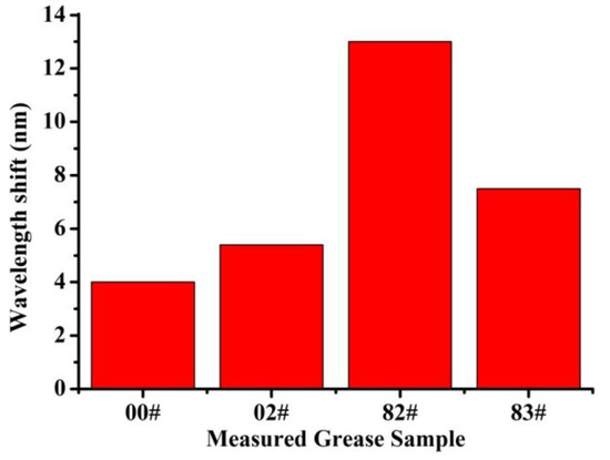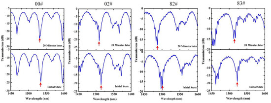 Figure 8 illustrates the wavelength dips shift of grease samples 00#, 02#, 82# and 83# at a coarse vacuum of ~20 Pa. For grease sample 00#, the wavelength dip shift was about 4 nm, less than the dip shift of other grease samples. The wavelength dip shift of sample 82# was the largest, about 12 nm. The dips shift of samples 02# and 83# were 5.4 nm and 7.5 nm, respectively, between the dips shift of samples 00# and 82#. From the experimental results, it can be clearly seen that grease sample 00#, with less volatilization, was more suitable for the vacuum environment of HPLs, while grease sample 82# was the opposite. Moreover, the results demonstrate the feasibility of the proposed sensors.