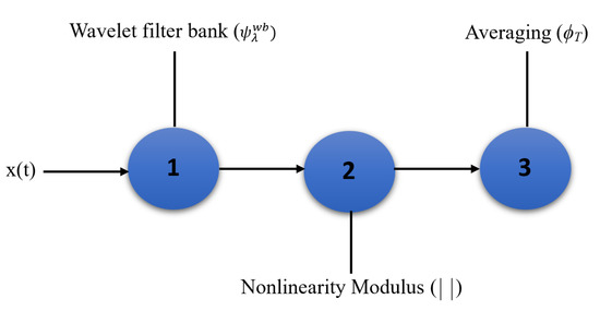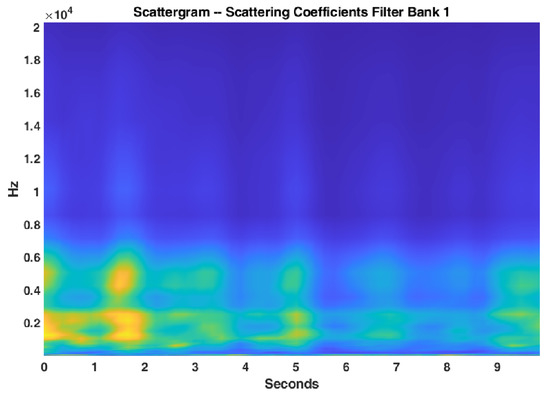 where is a notation for time averaging using and ∗ denotes the convolution integral. The output is approximately equal to MFCC, and is commonly known as first order scattering coefficients [58]. This averaging eliminates some high frequencies details. To recover high frequencies details, is applied to the second wavelet filter bank . Similarly to Equations (8)–(10), making some assumptions, one can have: