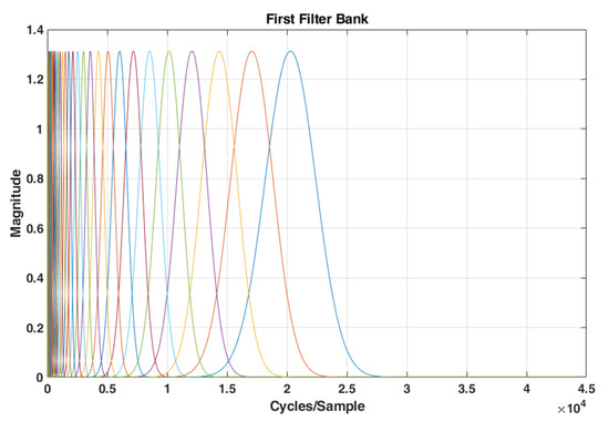where , is the total number of bank filters, C is a constant, and are lowest and highest pass band frequencies of the filterbank, and is the Number of Voices per octave. The value of must be less than or equal to half of the sampling frequency. The lowest-frequency interval is covered with about equally-spaced filters with constant frequency bandwidth to guarantee that the filter bank covers all frequencies. For simplicity, these filters are still identified as wavelets. The frequency response of filters is given in Figure 2. The narrow band of filters in lower Cycles/Sample shows the inherent property of WST to extract more details in low bands.