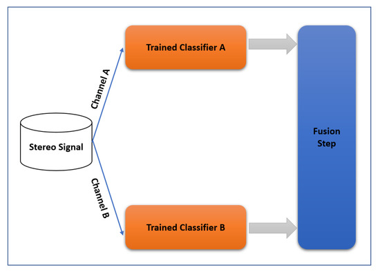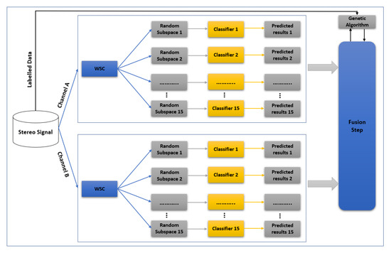 Figure 4 shows the block diagram of the training scheme of the proposed method. The two channels of input stereo signal are first decomposed to left (A) and right (B) channels. Feature extraction is then performed by applying wavelet scattering to A and B channels separately. Two ensemble classifiers are trained for the channels. The differences, such as delays and noises, between channels lead to different ensemble classifiers that are important in the proposed step. The output of each classifier (A and B) is sent to the fusion step. In the training phase of the fusion step, a genetic algorithm (GA) finds the coefficients of a nonlinear transform to maximize the accuracy of the final result. In fact, GA creates a combination of the two classifier outputs (after their training process) nonlinearly in order to increase the final accuracy. The proposed training scheme was implemented in the Matlab R2020b software package.