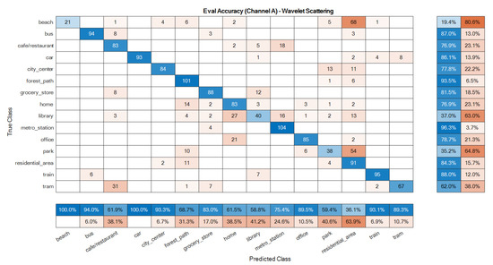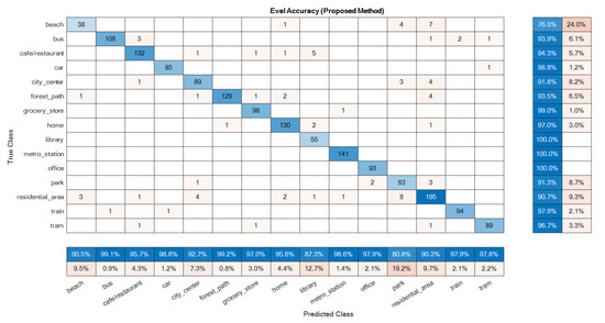 The proposed method was trained using the development dataset and tested on the evaluation dataset. As in many other works, the confusion matrix was considered an interesting criterion for comparing the proposed method with the existing state-of-the-art methods. As another evaluation criterion, the total accuracy of the proposed method was compared to the ones achieved by some related methods. The total accuracy was calculated by dividing the number of true classifications to the number of total test data.