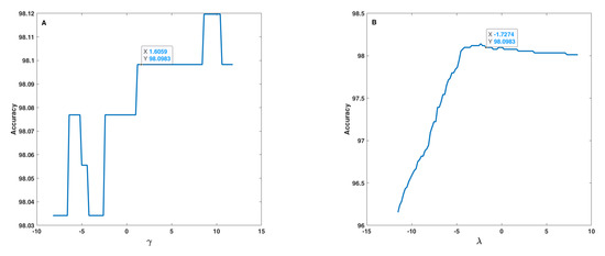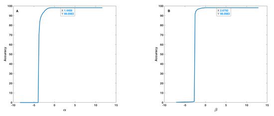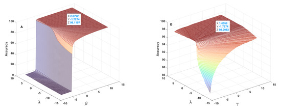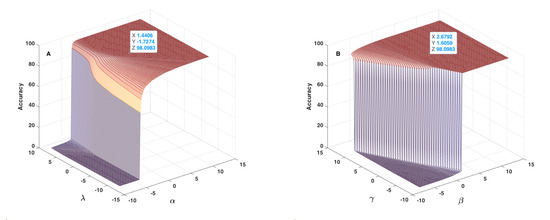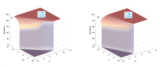 where and are scores assigned using ensemble classifiers to class i, belong to A and B channels, respectively. Obviously, if the result of the classifiers are similar, the value of Equation (14) leads to the maximum and , , , are the parameters that should be found to maximize the accuracy in cases where the classifiers’ results are different.