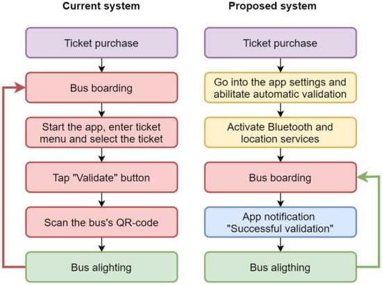 Figure 1 shows the different sets of actions that any user must carry out when using the smart ticketing app, both currently and when the proposed system will become operational. We assume that the users, whenever they want to travel using public transport, must have a valid ticket, purchased on the app, which they must then validate for their ride. The left side of the diagram in the figure shows the sequence of operations required to use the current system, while the right one indicates the set of different actions needed when the automatic features become available.