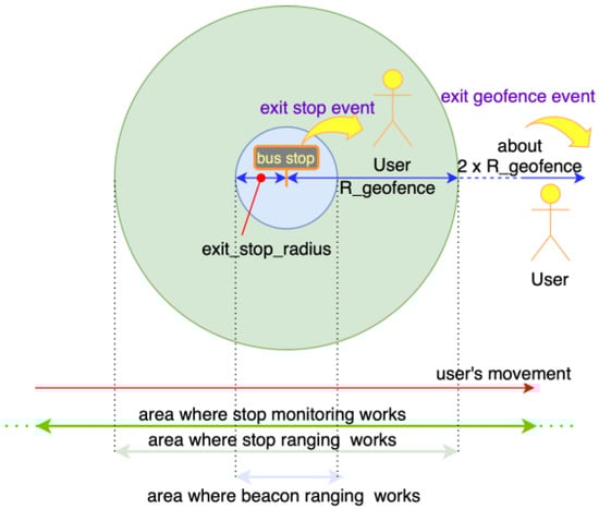 Figure 3. Detecting exit stop. - Region monitoring and ranging technologies will be more thoroughly described in Section 4.1. While location and motion sensors functionalities do not require any additional hardware, BLE requires beacons to be installed inside the vehicles. During a testing phase a wide set of options is preferred, so we choose to use BLE beacons providing a good level of customization (datasheets detail are available in Appendix A) [29]. As of now, only the iBeacon protocol has been implemented during testing, using the UUID as the system unique identifier, the ‘Major’ as the bus and company identifier and finally the ‘Minor’ as the beacon identifier inside the vehicle.