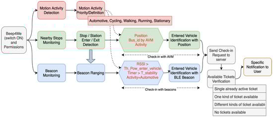 As pointed out in the three left-most blocks in Figure 6, the flow can be described starting from the processes used for determining motion activity, geofence sensing, and beacon sensing, which are active and detecting the presence of the users on the vehicle. Motion activity detection works exactly such as in the case of check-in: