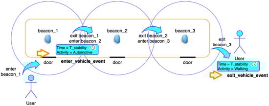 In this way, it is possible to understand if users are close enough to the beacons (belonging to the beacon region) having a certain major value and thus identifying a certain vehicle of a public transport company. If the power value (RSSI dBm) received from one or more beacons installed on a given vehicle (effectively identifying it) exceeds a predetermined threshold Th_Pow_Enter_Vehicle dBm (see Table 2) for a period of time longer than T_stability seconds (Table 2) and the current motion activity is Automotive (blue block with red text in Figure 4), then the system considers the users to be on board of the vehicle identified by his major (blue “Entered Vehicle Identification with BLE Beacon” block in Figure 4). The power threshold Th_Pow_enter_bus dBm depends on the environment in which the system has to function (mainly the type of vehicle) and the use-case and it has been set on the value present in Table 2 for identifying the enter_beacon event (see enter_beacon_1 in Figure 5). In Figure 5 we highlight the distinction between the enter_beacon event, caused simply by the RSSI from beacon_1 going over the Th_Pow_enter_vehicle threshold, ant the enter_vehicle event, caused by the RSSI going over the same threshold but for continuous period of time of T_stability seconds and by the measured motion activity being equal to Automotive. The power threshold depends also on the transmission power level Beacon_transmission_power dBm (Table 2) set for the beacons installed in the vehicle. The time interval T_stability is also dependent on the use-case and the working environment for the system. As an example, in all of the cases which require a higher level of accuracy, and an extreme system reaction speed when validating tickets is not needed, T_stability can be increased to also increase the level of confidence of the system when detecting the enter_vehicle event (Figure 5). The values set for per Th_Pow_Enter_Vehicle dBm and T_stability seconds in Table 2 reflect the experimental setup (described in Section 5.2) used during the experiments carried out between July and November 2020.