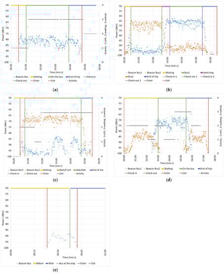 Also in this case, since the testers did not move from the bus stop, no data from the activity detection are represented in the graph. All of these tests helped greatly in reducing the range of available values to consider when setting a threshold for the minimum RSSI the system has detected to start the check-in process and a maximum for the check-out (Table 2).