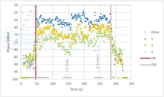 Figure 9 shows the power levels for one of the tests we conducted in this last phase. The continuous red line represents the instant when testers boarded the vehicle, while the dashed red one corresponds to the alighting. Different colors are associated to the beacons (based on their minor) to differentiate them. The beacons numbered 1, 2 and 3 are the ones installed inside the vehicle, while the “Other” ones, whose power levels are represented by grey dots, are those installed in other vehicles nearby.