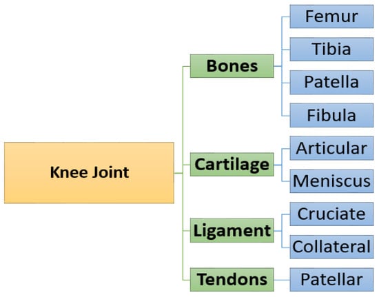 The knee joint divides into four main parts, (1) knee bones are involved in the femur, tibia, patella, and fibula. (2) Knee cartilage is the tissue that protects and shields the bones in the joint. (3) Knee ligaments are bands of tough, flexible, fibrous tissues that connect the bones’ ends and hold joints together, and the (4) knee patellar tendon connects the patella kneecap to the tibia [8]. The knee joint anatomy taxonomy [9] is as shown in Figure 1.