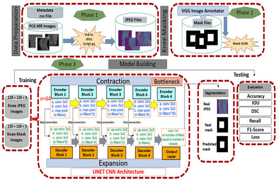 The segmentation framework of our proposed approach with phase 1 of data preparation, phase 2 of knee mask generation and phase 3 of model building with training and testing on our U-Net CNN architecture.