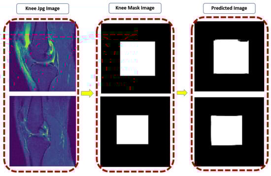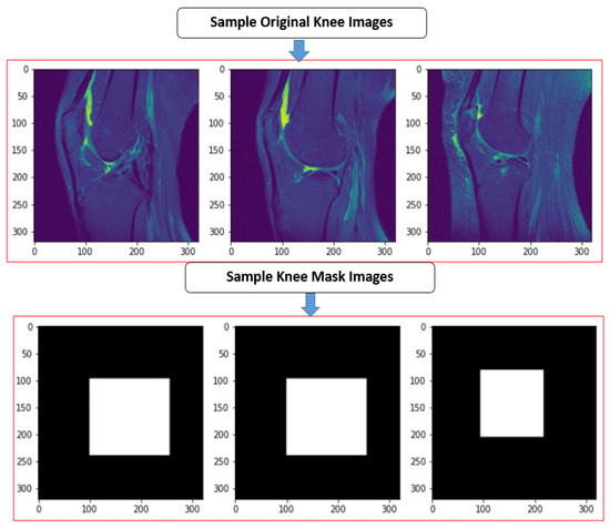 After unpickling all the pickle files into JPEG, we have to label the images into masking with the classes given in the CSV metafile. For this, each JPEG image was loaded into VGG image annotator (VIA) standalone manual annotation software [62]. For labeling the ROI area, the ROI script file was used to identify which particular image contained the data. The VIA tool marked out the labeling box of the JPEG. It created the knee mask and allotted their class labels into JSON (JavaScript Object Notation) format file. The sample jpeg images and knee mask images dimensions are 320 × 320 × 3, shown in Figure 4. The total number of knee JPEG and knee mask images was 15,268 slices.