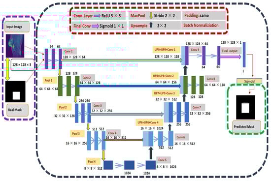 All of the JPEG and knee mask images were resized into 128 × 128 × 3 before being entered into the input layer, and the filters were fed 64, 128, 256, 512 and 1024, respectively. The first step of two convolution layers (Conv 1) output and kernel size was 128 × 128 × 64, 3 × 3, respectively, with rectified linear unit (ReLU). The padding same represent extra pixels on the edges and output image is the same as input. The next step was the max pooling with stride 2 × 2, the dimensions become half 64 × 64 × 64 of 128 by 128 as used 2 × 2 kernel. The two convolutional layers (Conv 2) output dimensions 64 × 64 × 128 where 128 filter. Repeat this process until bottleneck sage. At this stage, the pooling layer (Pool 4) dimension was 8 × 8 × 512, and on the right side 8 × 8 × 1024. The upsampling (UP6) again used stride 2 × 2 generated the dimension of 16 × 16 × 1024 after concatenating. Then couple of convolutional layers, and the result was 16 × 16 × 152. The batch normalization was used act as a regularizer, eliminating the need for Dropout [63]. Repeat this process until final layer of convolution, which was 128 × 128 × 1. Figure 5 illustrates the complete step by step approach of our U-Net.