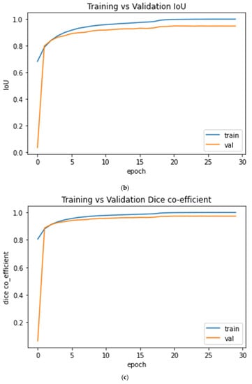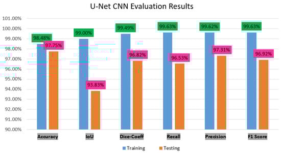Our results demonstrate in the figure above through deep learning there is not much difference in the accuracy score between the training and testing, respectively, 98.48% and 97.75%. However, the IoU, dice, coeff, revall, precision and F1 score difference was between 5% to 3%. Therefore, our model performance score has shown very good results.