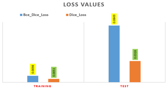 Furthermore, the error loss between the training and test are shown in Figure 9. The test error dice loss is much less as compared with BCE-dice-Loss, respectively, 0.00318 and 0.0849.
