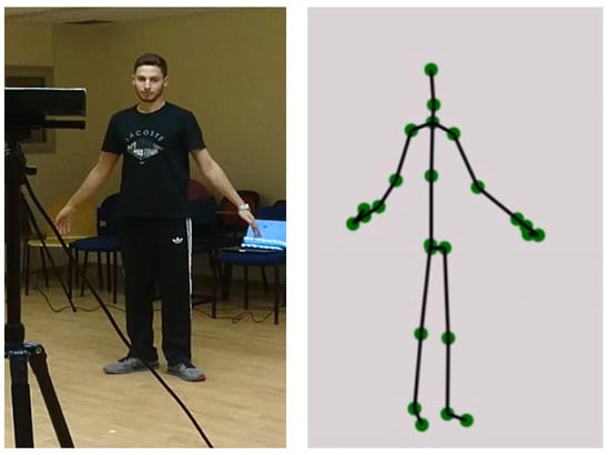 To track subjects performing the BBS tasks, we used the Microsoft Kinect [42], a depth sensor camera based on time-of-flight technology [66]. It provides depth information, i.e., the distance from the camera, for every point in the scene for each video frame. When filming human subjects, a skeletal body representation composed of 3D joints and connecting bones (Figure 2) is extracted from the captured depth information using machine learning algorithms [67,68,69]. For the purpose of tracking and estimating BBS task performance, we also collected the 3D data points in the patient’s immediate surroundings, floor position, and orientation, as well as the 3D points of objects in the scene relevant to the BBS task.