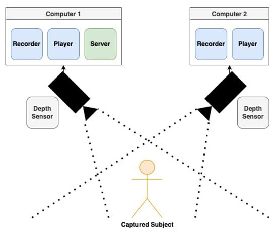 Thus, we used a novel multi-camera tracking system developed by our team [48,70] in which synchronization and calibration are performed automatically and on the fly by exploiting the patient’s motion. The skeletal data acquired by the two calibrated cameras can then be easily integrated. Using this multi-depth-sensing camera tracking system allows motion and pose tracking of subjects to be non-intrusive, portable, and inexpensive.