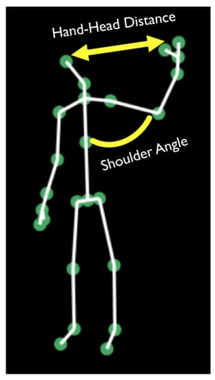 To train the BBS score prediction models, sets of features were defined for each of the 14 BBS tasks. The skeletal sequence acquired for each subject per each BBS task (Figure 3) served as the basis for the features. Feature extraction was performed in two steps. First, features were extracted from the skeletal structure of each frame in the sequence. These included: relative positions of skeleton joints, angles between connecting bones, distances between body parts, heights of joints from the ground, and more (Figure 4). Most of the extracted features were independent of the location of the subject and invariant to body size.