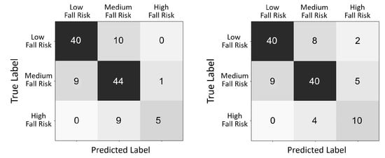 Figure 5a shows the accuracy results in predicting the final risk of fall in one of three categories (high, medium, and low risk of fall). Results are shown as a 3 × 3 confusion matrix comparing the true risk of fall class as determined by the physiotherapists (the sum of the BBS scores assigned by the physiotherapists) with the predicted risk of fall. The overall accuracy was 75.5% correct with an MSE of 0.25. A concern in assessing the risk of fall is the false negative rate (e.g., nine subjects at high risk were classified as medium risk). The ML algorithm allows reducing the false negative rate by adjusting the thresholds. Figure 5b shows the confusion matrix obtained when reducing the false negatives to four subjects. This, however, incurred an increase in false positives and in the MSE (to 0.29).