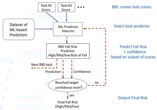 Considering the BBS assessment as an iterative process (where one task is performed per iteration), every iteration can be considered as a “partial predictor” of the final fall risk assessment category. As additional tests are performed and task scores are accumulated, the prediction becomes more accurate. Thus, we used ML to develop a method in which the BBS tasks were ordered in a manner that optimized for accuracy of the final fall risk prediction and allowed for the testing to terminate early when the prediction reached a high confidence level. The BBS tasks may be administered in a predetermined optimal order constant across all subjects or may be adaptively determined per subject. Either way, the number (and consequently, the time required to perform the BBS assessment) was significantly reduced, making the whole process more efficient.
