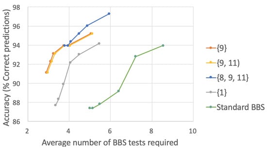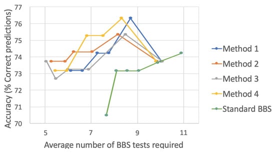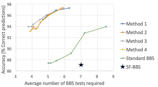 Given a starting subset of BBS tasks, a confidence threshold, and a training set, each of the four selector methods produces a different optimal ordering of BBS tasks. To evaluate the performance of each such ordering, we used five-fold cross-validation on the training set. For consistency, we also compared the results with the standard ordering of BBS tasks [7,8], as well as the Short-Form BBS (SFBBS), which selected a subset of seven tasks to be performed [34] (see Section 1.1).