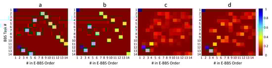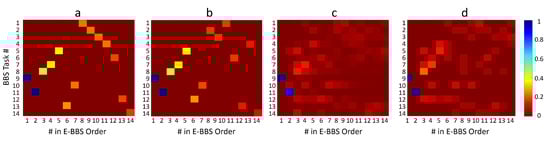 It can be seen that the first two selector methods produced a task sequence that was independent of the patient input. Thus, these selector methods produced a constant order of BBS tasks that was later used on all patient data when testing. Selector Methods 3 and 4 are adaptive, as the NT task is chosen based on training data, which are dependent on the data of the patient being tested. Thus, for each patient, a different BBS sequence of tasks is produced. However, we show later in Section 5.3 that, in fact, all E-BBS sequences shared the same initial portion of the task sequence.