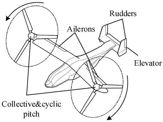 The configuration of the studied dual-tiltrotor UAV is shown in Figure 1. The studied dual-tiltrotor UAV is powered by two motor-driven helicopter rotors mounted at the tip of the wing. Its rotors have the same collective pitch and longitudinal cyclic pitch mechanisms as the helicopter. The two rotor nacelles can tilt forward from the helicopter mode to the fixed-wing mode symmetrically. Apart from the rotors and nacelles, the main body of the UAV has a normal configuration of the fixed-wing aircraft, which has ailerons, elevators, and rudders, as shown in Figure 1. The controls of the aircraft are listed in Table 1. The rotors and aerodynamic surfaces can both generate control moments in the roll, pitch, and yaw channels. Thus, the studied dual-tiltrotor UAV has redundant controls for the longitudinal and latitudinal control channels.