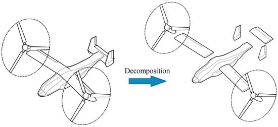 A component-based method is used to theoretically model the aerodynamics of the tiltrotor UAV [29]. In the model, the aircraft is divided into several components that generate aerodynamic forces and moments, as shown in Figure 2. They are modeled separately and then assembled along with the gravity to estimate the forces and moments experienced by the aircraft.