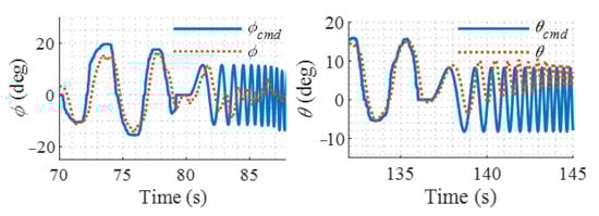 It is shown in Figure 10 that the main difference between the proposed and original LADRC controller is the added actuator models described in (4)–(7). Instead of directly feeding to the LESO, servo and rotor flapping dynamics models are integrated into the controller to synchronize and , which avoids the oscillations of the closed-loop system.