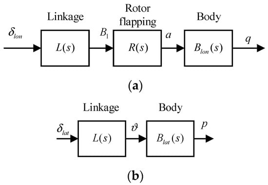 The rotor-body coupling model for the system identification is simplified to a cascade single-input-single-output form. It contains the least number of model parameters that can well approximate the response of the aircraft [29,31]. The longitudinal and lateral models are shown in Figure 6, where is the symmetric longitudinal cyclic pitch command, is the asymmetric collective pitch command, is the longitudinal cyclic pitch angle, is the collective pitch angle, is the longitudinal flapping angle, and and are the aircraft’s roll and pitch angular speeds. As for the lateral model shown in Figure 6b, the rotor flapping transfer function is removed, as the roll control only engages the asymmetric deflections of the collective pitch and it does not cause the tilting of the tip-path-plane.
